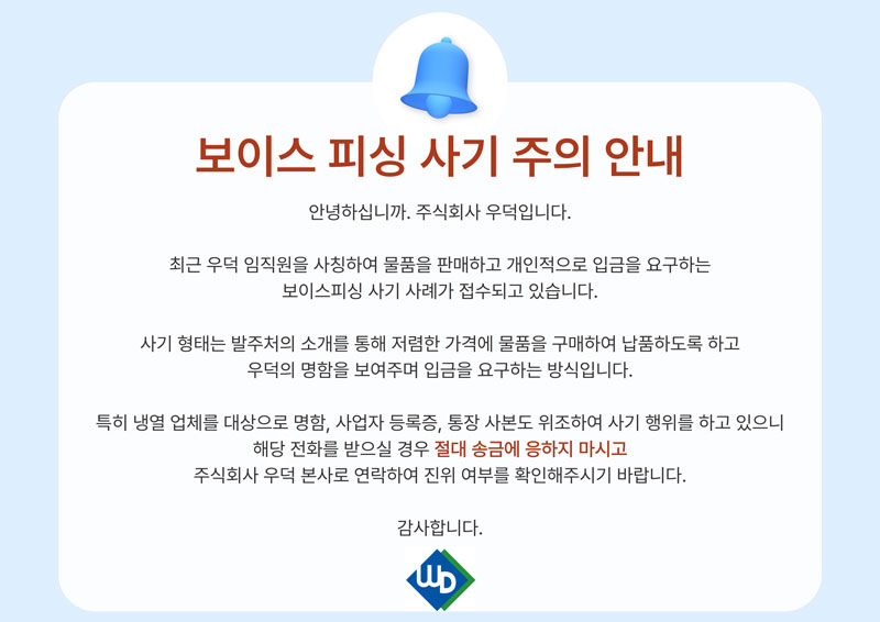 안주하는 기업이 아닌 항상 새로운 기술력을 보유 및 창조하기 위하여 전 직원이 매진하는 기업이 되기 위하여 노력하고 있습니다. 전문적인 기술과 노하우로 신뢰 할 수 있는 주식회사 우덕이 될 수 있도록 최선을 다하는 기업으로 항상 고객 여러분과 함께 하겠습니다.